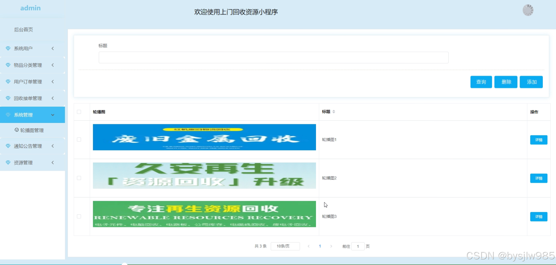 管理员在“系统管理”界面可以对轮播图进行查看和管理,在轮播图界面点击“添加”按钮进入添加页面、填写标题、上传图片即可完成轮播图的添加,还可以对轮播图进行查询、重置、删除操作。系统管理界面如下图5-11所示。