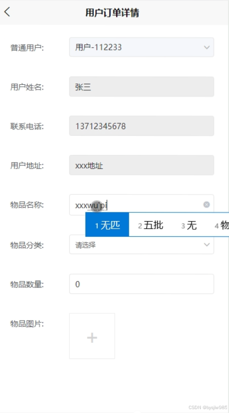 用户订单:当用户点击首页导航栏的“用户订单”钮将页面可查看用户订单详情,输入用户姓名、联系电话、联系地址、物品名称、物品分类、物品数量和物品图片,即可声称回收订单,用户订单界面如图5-5示。