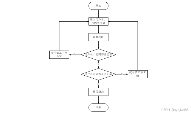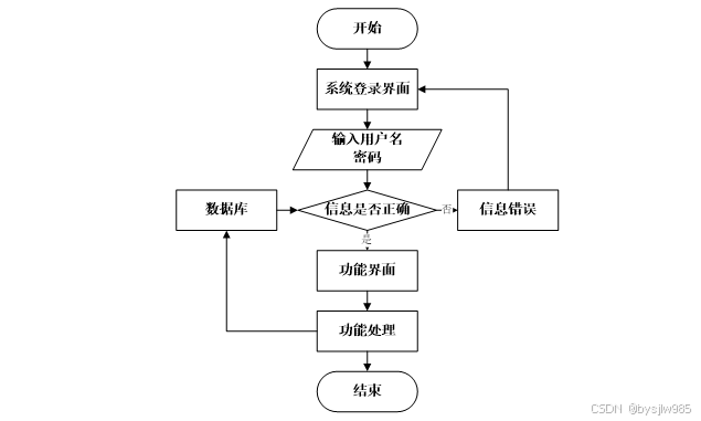 用户打开并进入系统后,会先显示登录界面,输入正确的用户名和密码,系统自动检测信息,若信息无误,则用户会进入系统功能界面,进行操作,否则会提示错误无法登录,操作流程如图3-3所示。