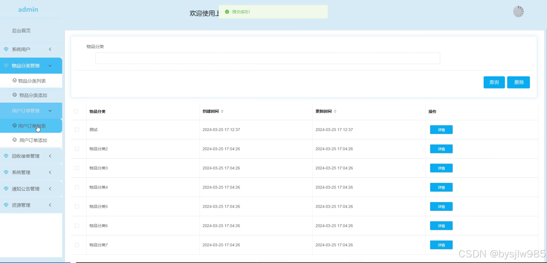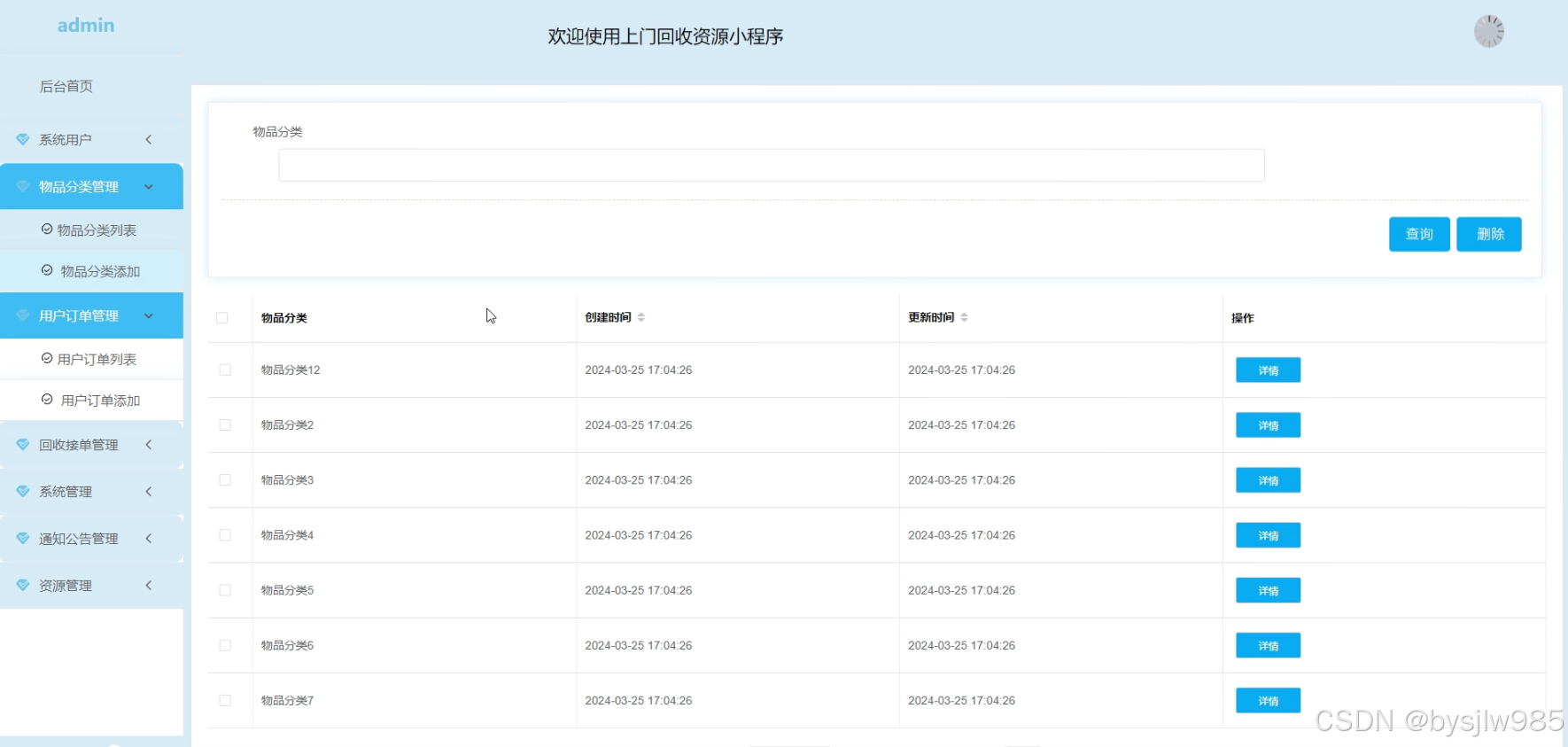 管理人员在“物品分类管理”这一菜单中可以对物品分类进行详情、查看、或删除等操作。