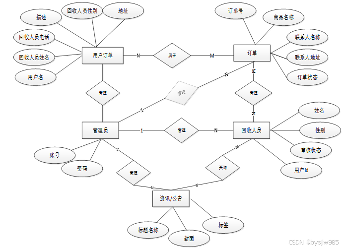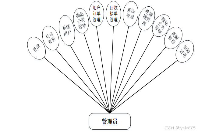 (1)管理员模块:系统中的核心是系统管理员,管理员登录后,通过管理员菜单来管理后台系统。主要功能有:后台首页、系统用户、服务反馈管理、系统管理、物品分类管理、用户订单管理、回收接单管理、系统管理、通知公告管理、资源管理等。管理员用例图如图3-1所示。