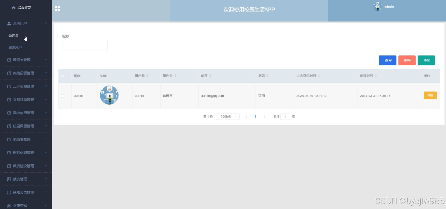 (2)系统用户:当管理员点击“系统用户”时,可以查看管理员和普通用户,同时可对系统用户进行添加、删除和修改用户信息,管理用户权限和角色等。