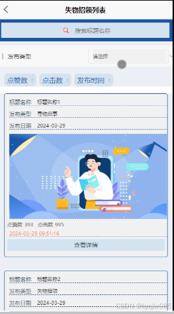 失物招领:当用户点击“失物招领”时,可以查看发布失物招领和寻物启事信息。界面如下图6-8所示。