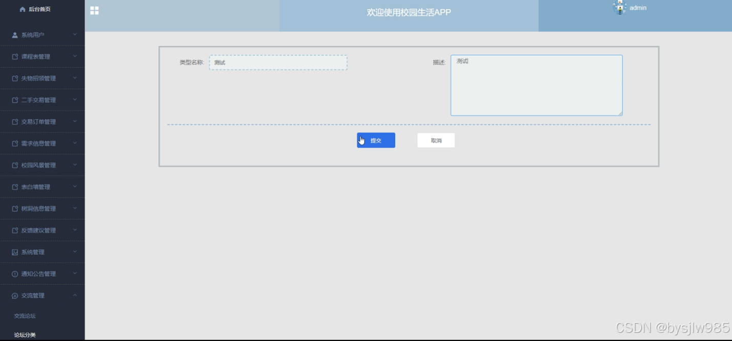 (14)交流管理:当管理员点击“交流管理”时,可查看交流论坛、论坛分类;如需添加新的交流论坛,点击右侧“添加”按钮,输入交流名称和描述,点击“提交”按钮进行添加。如需添加新的论坛分类,点击右侧“添加”按钮,上传封面图,输入标题,学则分类,输入标签、昵称和正文,点击“提交”按钮进行添加。
