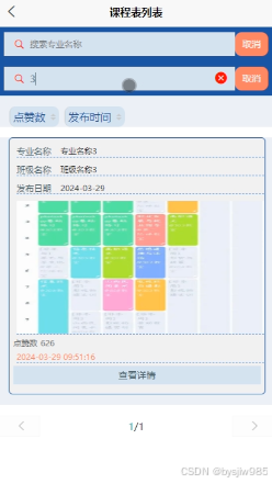 (6)课程表:当用户点击“课程表”时,可通过搜索班级名称、课程时间和课程学进行浏览课程课表,同时可对课程课表进行点赞收藏。