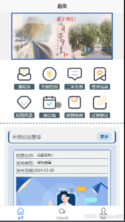 (2)首页:当进入校园生活APP的时候,首先映入眼帘的是系统的是首页、交流论坛、我的、网站公告、课程表、失物招领、二手交易、需求信息、校园风景、表白墙、树洞信息、反馈建议等内容。