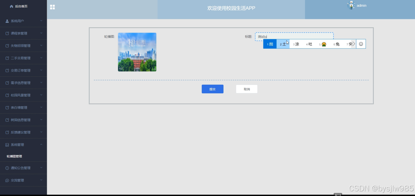 (12)系统管理:当管理员点击“系统管理”这一菜单时,可查看轮播图管理,如需添加新的轮播图,点击下方“添加”按钮,上传轮播图,填写标题,点击“提交”按钮进行添加。同时管理员可对轮播图进行增删改查。