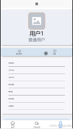 (3)我的:当用户点击“我的”,可在基本信息中修改个人资料,可在收藏中查看个人收藏;可以操作基本信息、收藏、失物招领、二手交易、交易订单、需求信息、表白墙、树洞信息、反馈建议等信息。