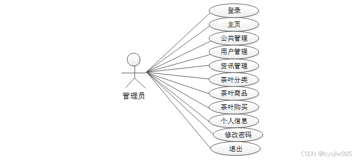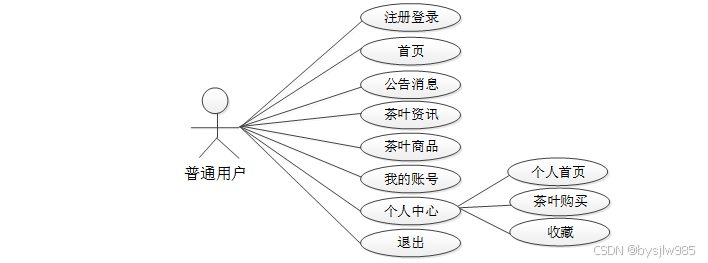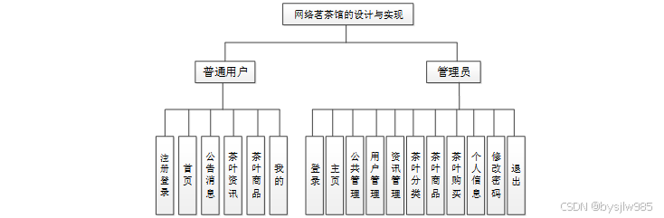 按照网络茗茶馆的设计与实现的角色,主要包括普通用户模块和管理员这两大功能模块,各模块功能内容如下: