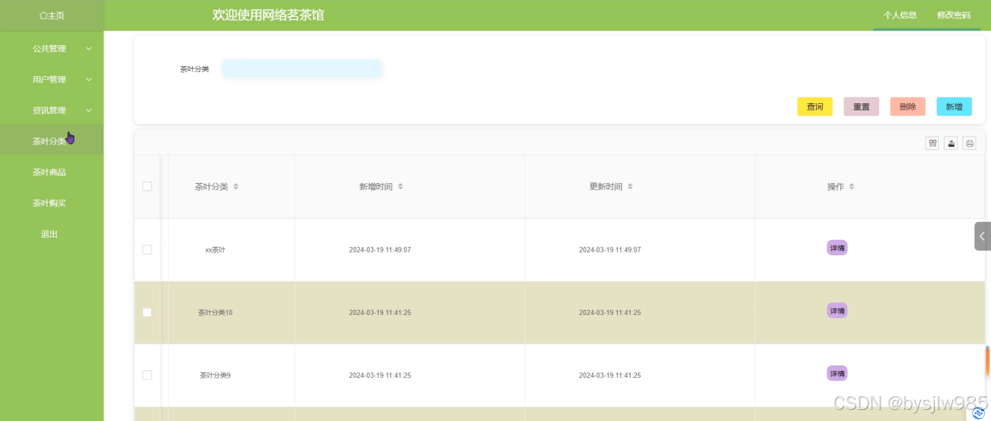 - 茶叶分类:管理员可以查看茶叶分类列表中某一分类的详情,可以对茶叶分类信息进行查询、重置、新增和删除操作。