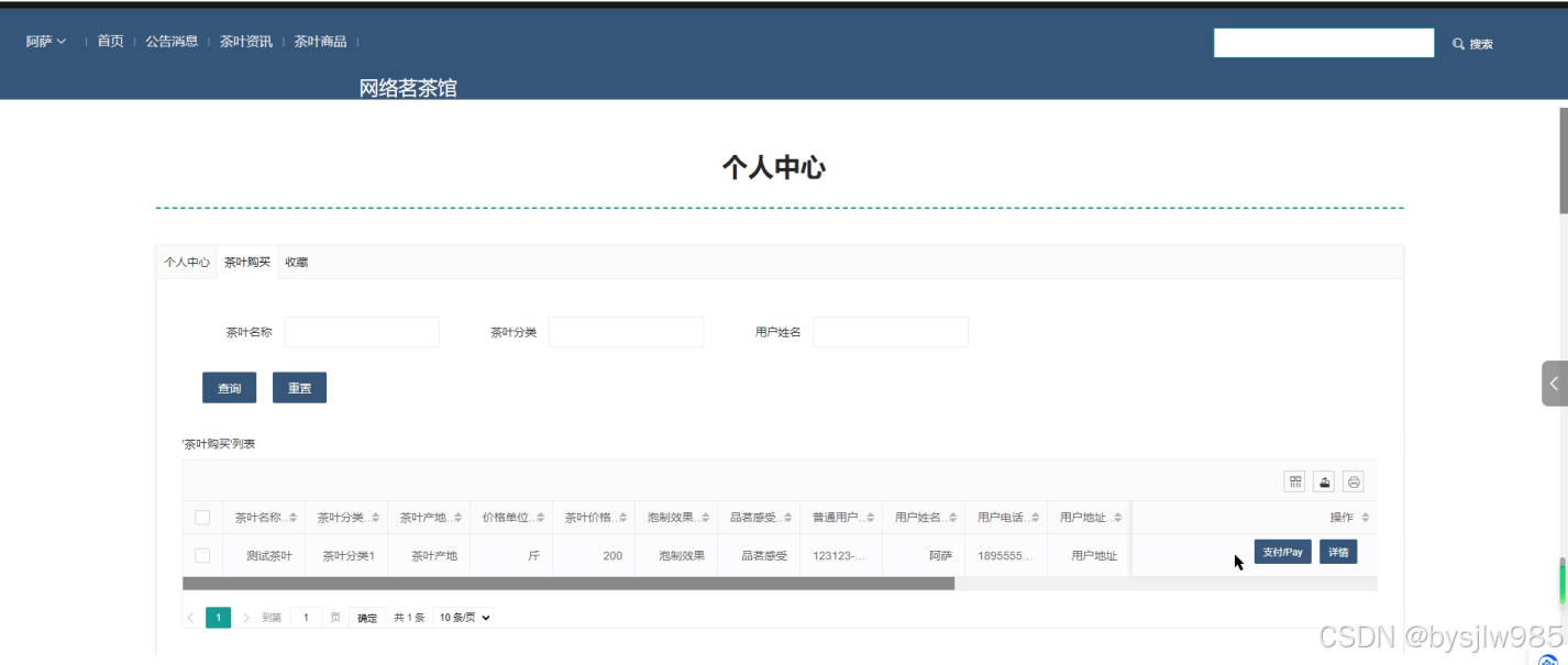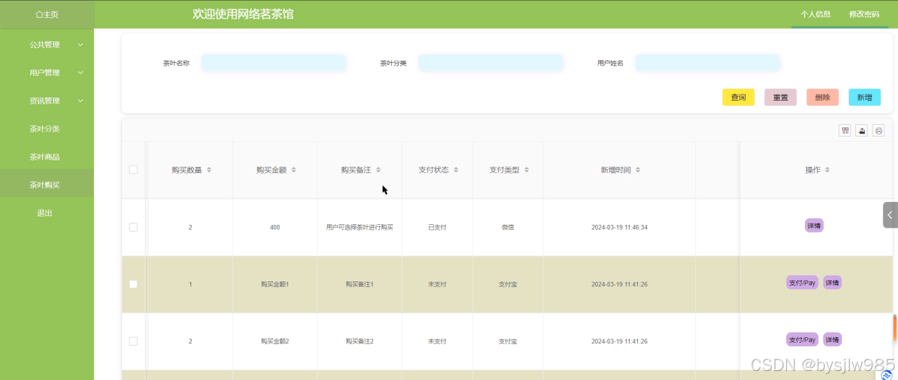 - 茶叶购买:管理员可以查看茶叶购买列表中某一用户的购买详情和支付信息,可以对茶叶购买信息进行查询、重置、新增和删除操作。