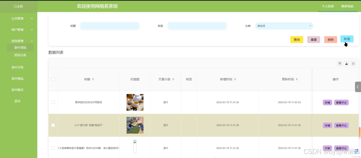 - 资讯管理:管理员可以查看茶叶资讯列表中某一资讯的详情和评论信息,可以对茶叶资讯、资讯分类信息进行查询、重置、新增和删除操作。