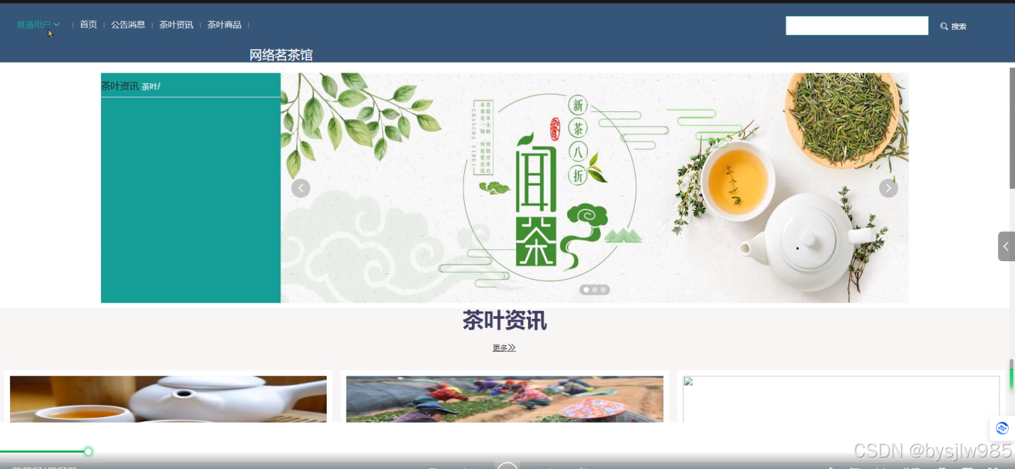 - 首页:首页界面是用户访问系统的入口页面,用户可以查看首页展示的轮播图,茶叶资讯、茶叶商品等信息。