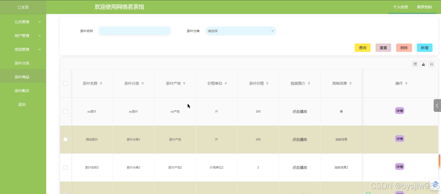 - 茶叶商品:管理员可以查看茶叶商品列表中某一商品的详情,可以对茶叶商品信息进行查询、重置、新增和删除操作。
