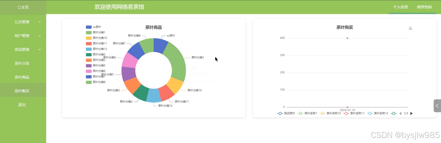 - 主页:管理员可以查看主页展示的茶叶商品、茶叶购买统计图信息。
