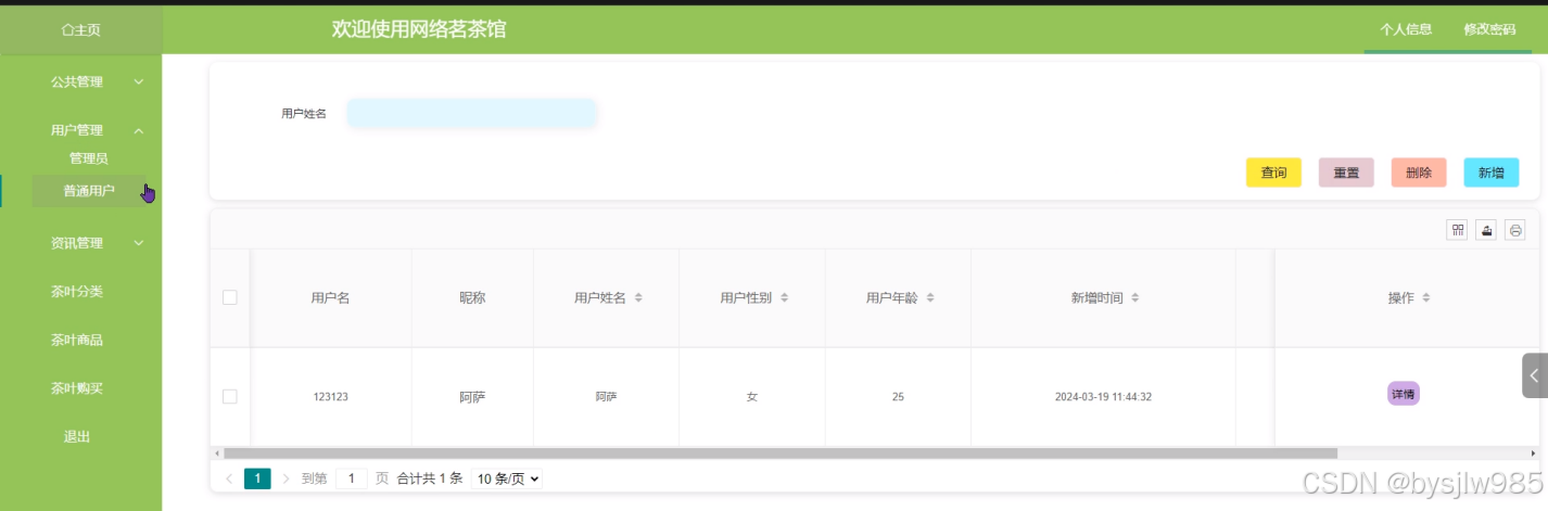 - 用户管理:管理员可以查看系统用户(管理员/普通用户)列表中某一用户的详情,可以对用户信息进行查询、重置、新增和删除操作。