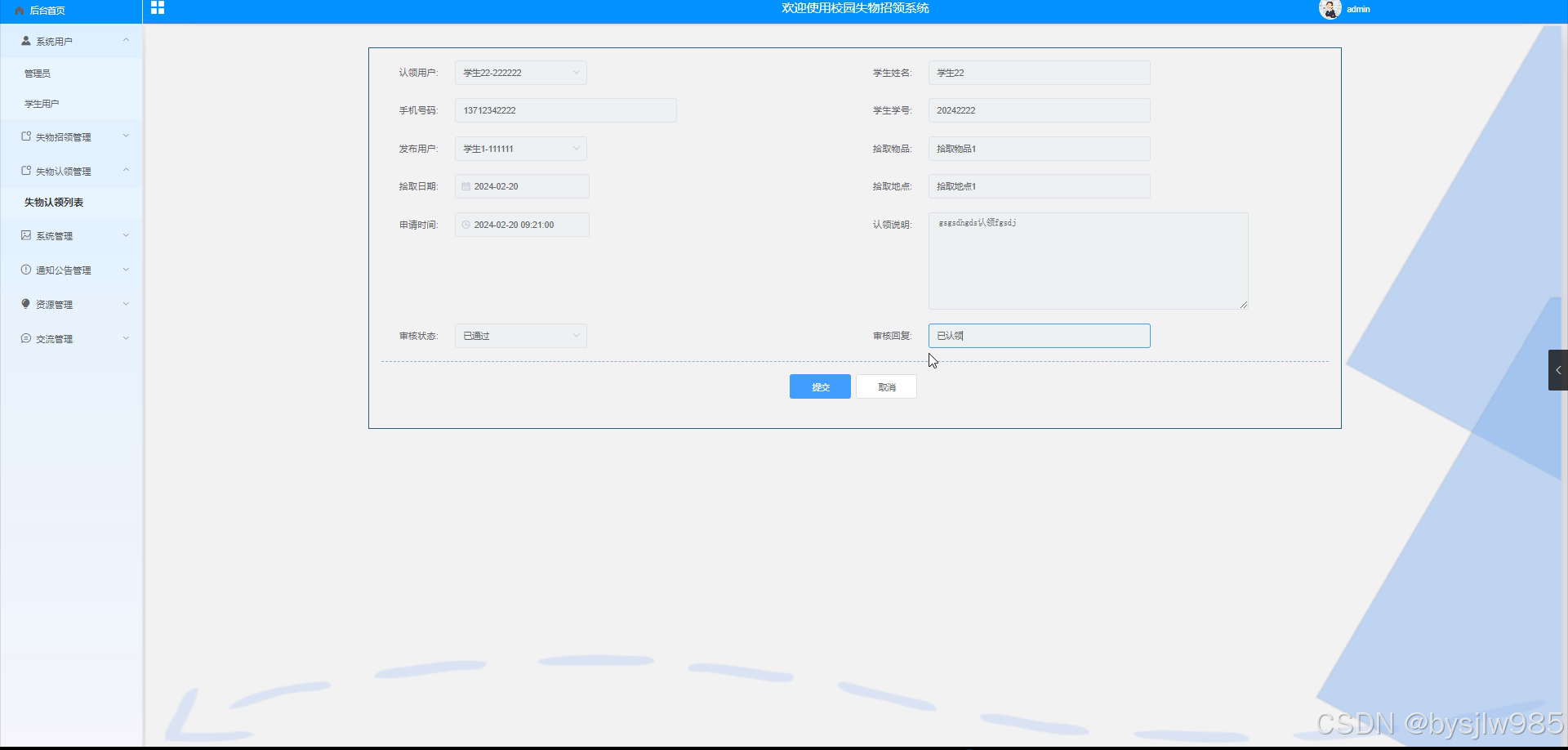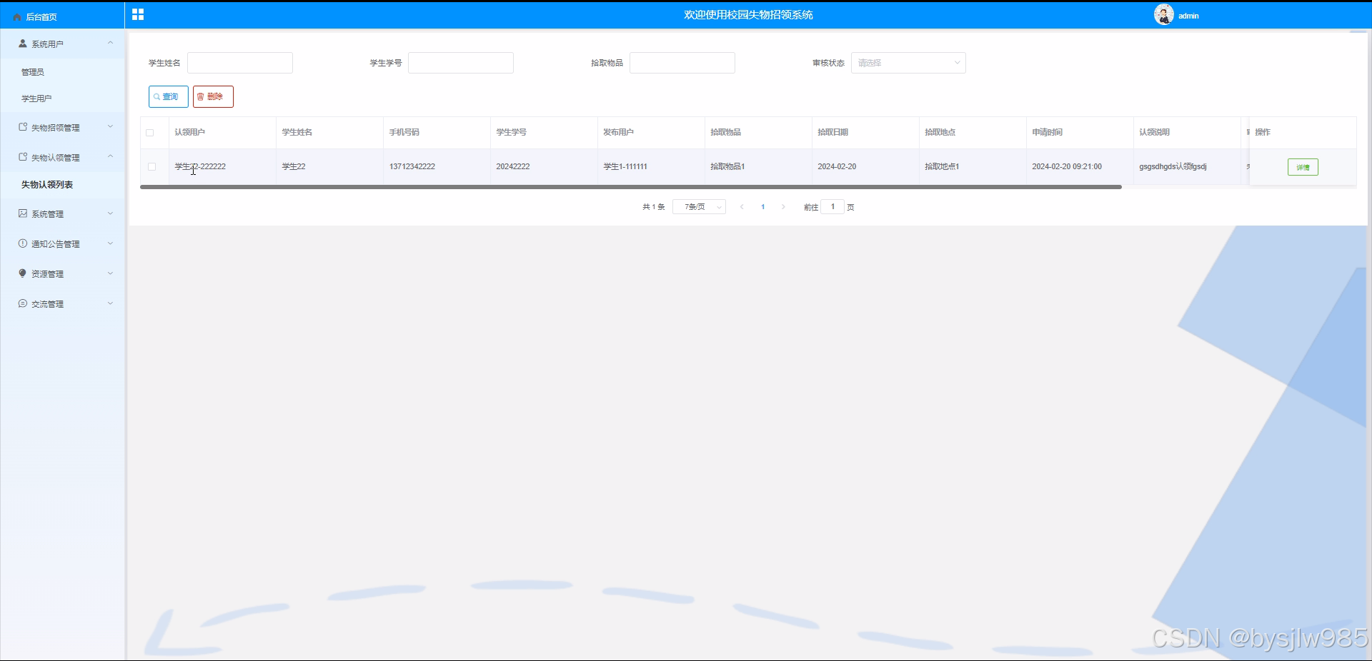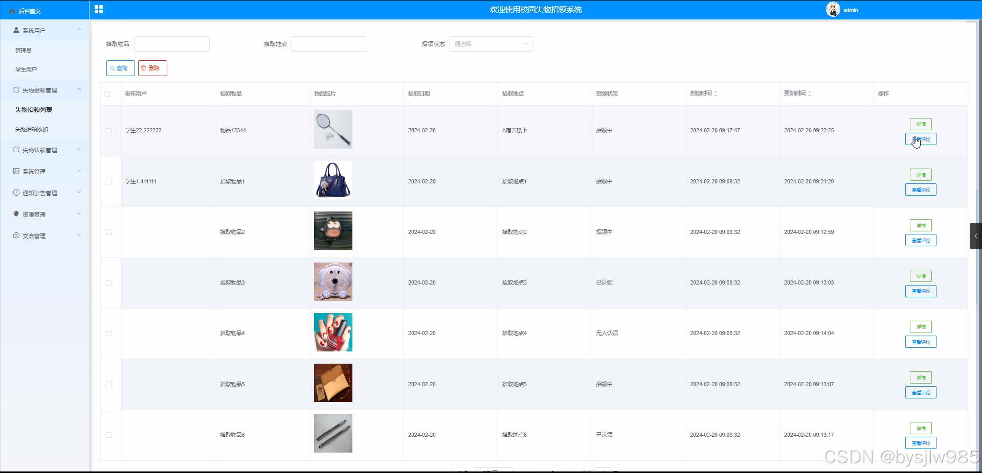 失物认领列表: 查看所有失物认领信息,进行管理操作。