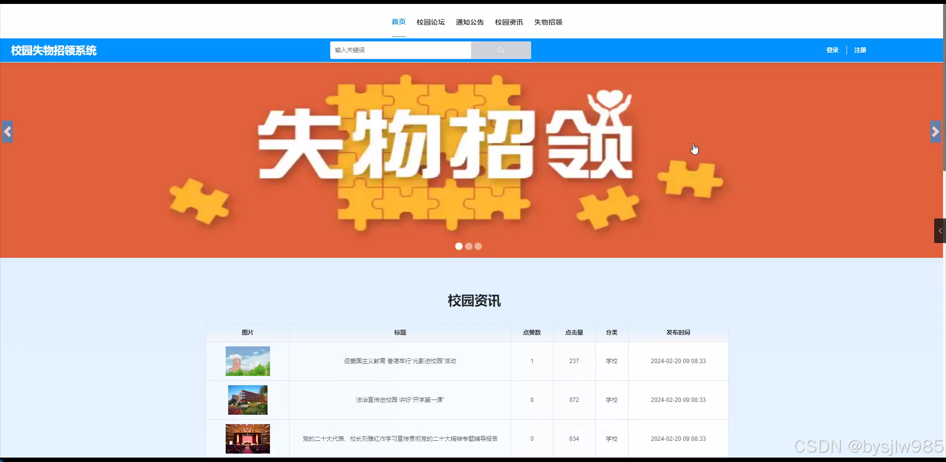 首页:展示系统信息、热门帖子、最新失物失物招领等内容。