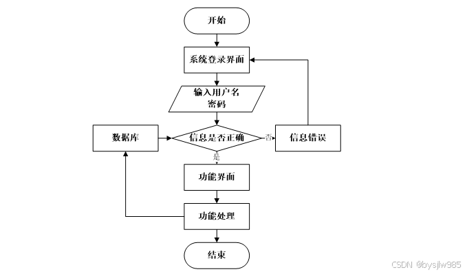 用户打开并进入系统后,会先显示登录界面,输入正确的用户名和密码,系统自动检测信息,若信息无误,则用户会进入系统功能界面,进行操作,否则会提示错误无法登录,操作流程如图2-6所示。