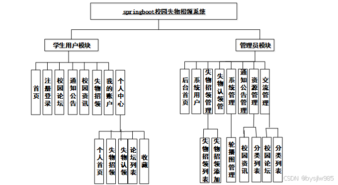 校园失物招领系统划分了学生用户管理模块和管理员模块这两大部分。