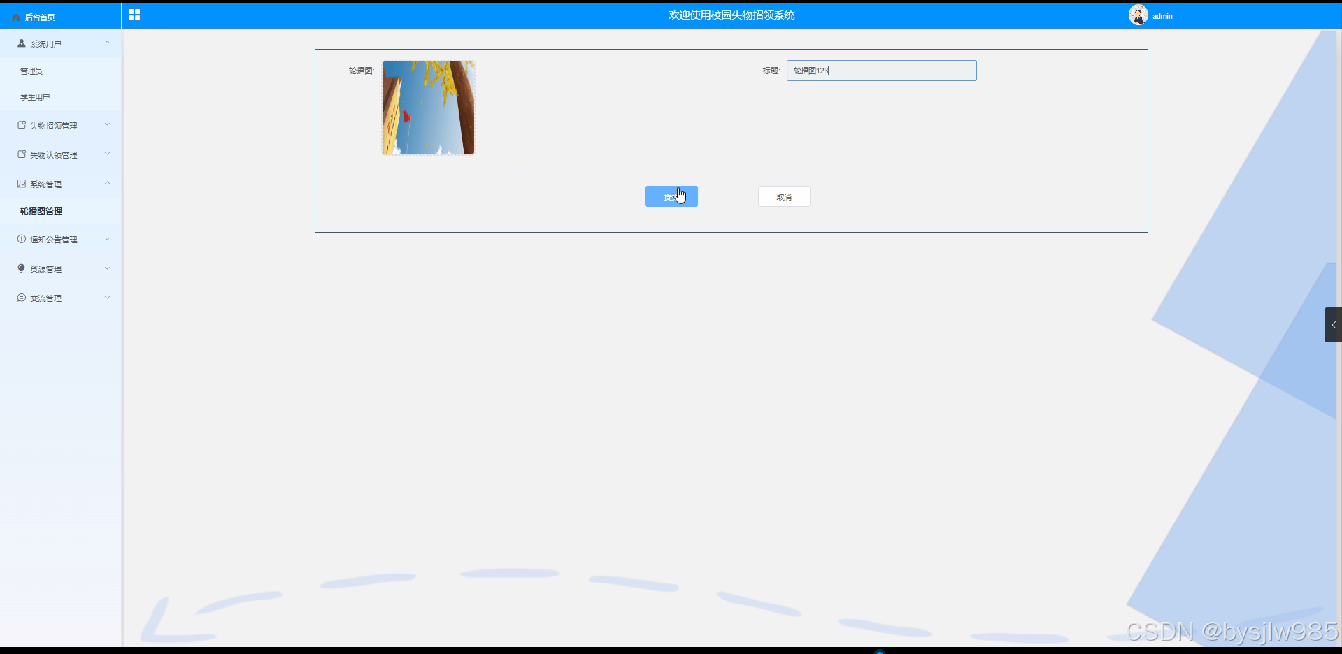 管理员点击“系统管理”这一菜单会显示轮播图这个子菜单,管理员可以对前台展示的轮播图进行设置,界面如下图4-12所示。