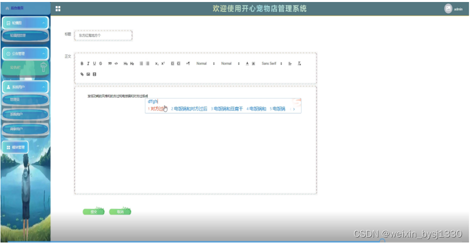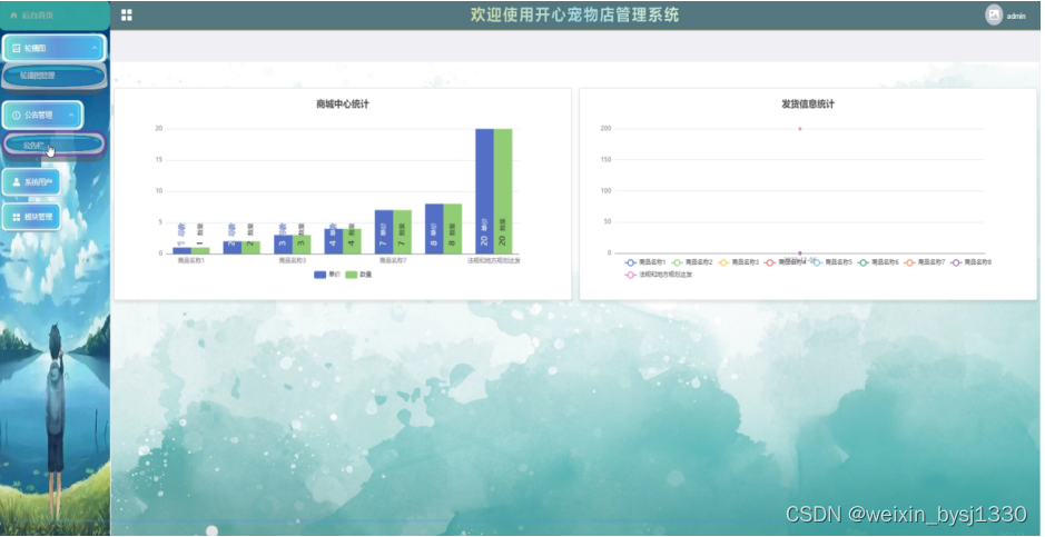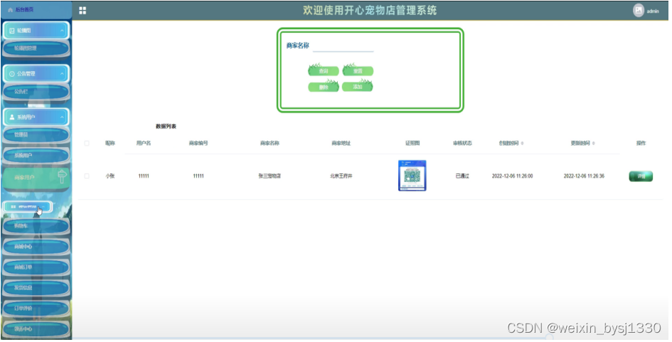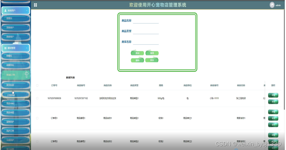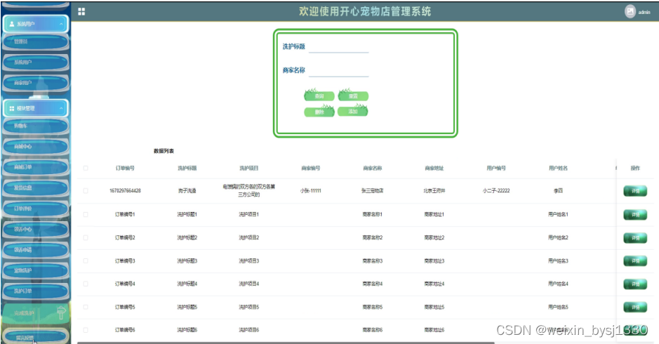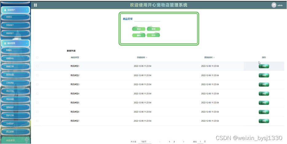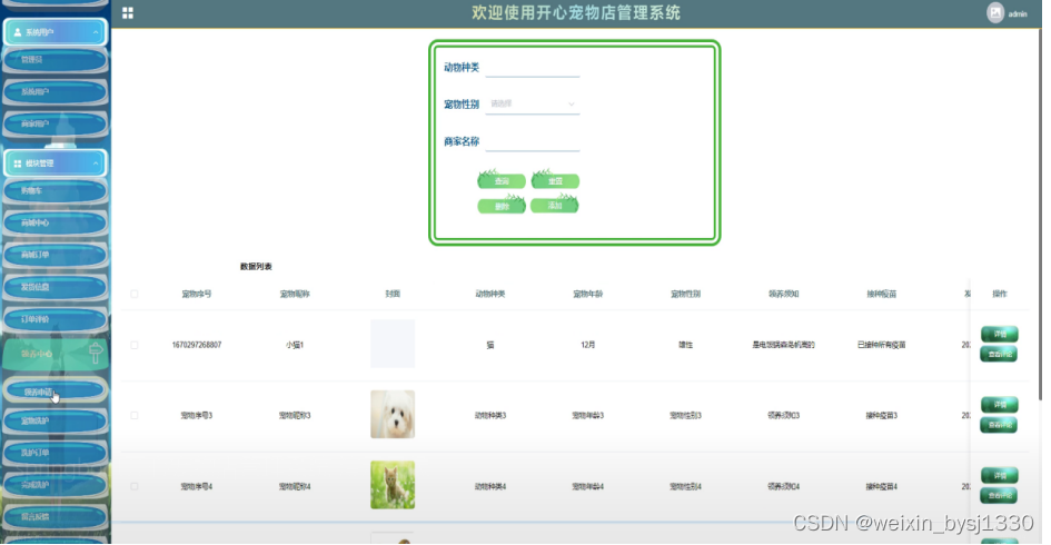 6.管理员功能,管理员可以对用户或者宠物进行管理。