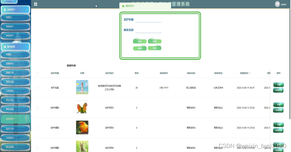 宠物洗护管理,在此页面中可以查看到商家的宠物洗护订单信息,并对洗护订单进行维护管理等操作,如图4-11所示。