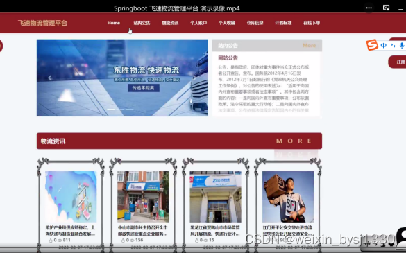 (1)首页信息:当用户进入本物流管理平台的前台的时候,首先展示在眼前的是导航栏、轮播图、公告栏等信息,用户可以根据自己个人的需求进行查看;