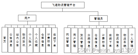 物流管理平台整体的功能模块包括管理员+注册用户两个模块,实现了对物流相关信息的查询管理,系统功能模块如图所示。