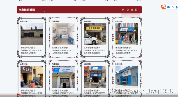 当用户点击“仓库信息推荐”这一菜单按钮,会显示管理员在后台发布的所有的仓库信息推荐信息,支持通过关键词对仓库信息推荐进行搜索,选择需要的仓库信息推荐点击可以进入到仓库信息详细的介绍界面,在详细界面可以查看到公司的图片区域名称、仓库编号、仓库名称等信息,同时可以进行点赞、收藏、操作,快递公司界面如下图4.5所示。