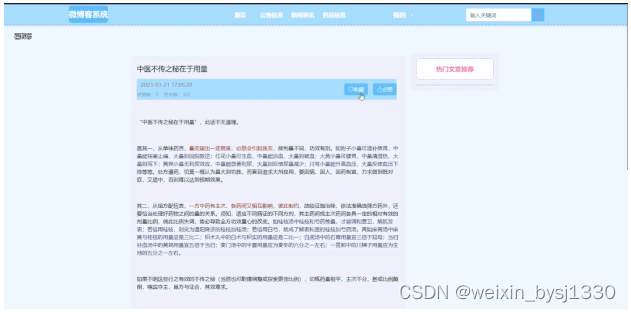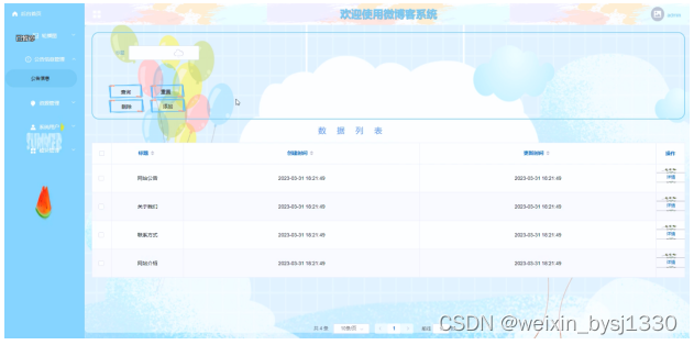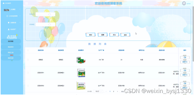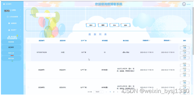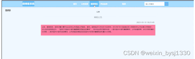 The main functional modules of the microblog system include rotation chart management, announcement information management, system user (administrator, registered user, doctor user) resource management (news information, news classification list) module management (drug information, drug inventory, drug storage, drug delivery), adopting an object-oriented development model for software development and hardware installation, It can well meet the actual usage needs, improve the corresponding software installation and program coding work, adopt MySQL as the main storage unit for backend data, and use the spring boot framework, Java technology, Ajax technology for business system coding and development, achieving all the functions of this system. This report first analyzes the background, role, and significance of the research, laying the foundation for the rationality of the research work. Analyze the various requirements and technical issues of the microblogging system, prove the necessity and feasibility of the system, and then provide a basic introduction to the technical software and design ideas required for designing the system. Finally, implement the microblogging system and deploy it for operation.