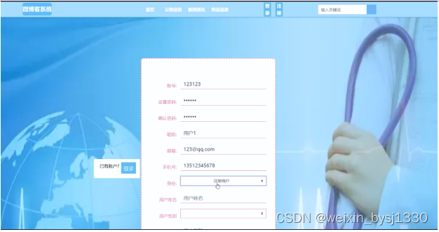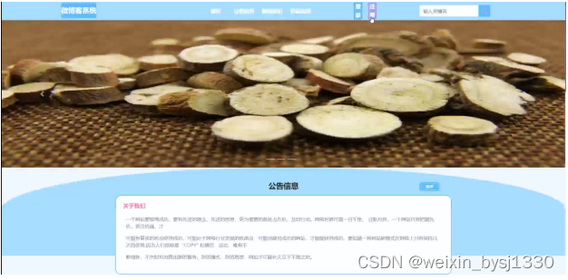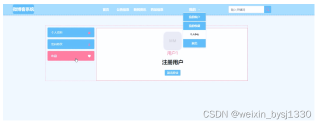 (2)查看微博客系统的首页信息:微博客系统的首页信息包含了首页、交流论坛、公告信息、新闻资讯、个人账户、个人收藏、药品信息、个人中心。