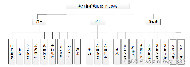 微博客系统划分为了注册用户模块、医生用户模块和管理员模块这三大部分。