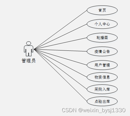 (3)确定好系统使用的技术,进行在线确认系统所划分的用户角色,并且根据用户角色划分确定所要设计的功能模块,对于南宁市抗疫物资管理小程序系统的设计主要划分别为管理员和用户角色,并所使用的功能模块也相应不同,但是系统的数据库实现的内容是交互的,用户可以随时根据自己的需求进行课程信息,对于系统工作人员可以根据自己的分管内容进行在线信息的处理及操作,管理员获取到所有用户的详细数据信息,并根据需求进行第一时间处理解决。