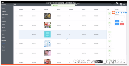 物资信息管理,在物资信息管理页面可以查看索引、物资名称、物资封面、物资类型、物资数量、包装形式、物资规格、物资详情等信息,并可根据需要进行修改或删除操作,如图5-12所示。