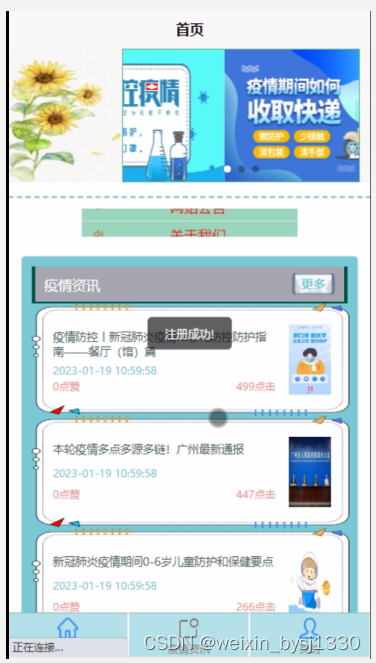 疫情资讯,在疫情资讯页面可以查看标题、资讯内容、封面等信息,并可对资讯进行点赞、收藏等操作。如图5-4所示。
