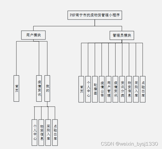 基于南宁市抗疫物资管理小程序的设计基于现有的手机,可以实现首页、轮播图、疫情公告、资源管理(疫情资讯、资讯分类)系统用户(管理员、普通用户)模块管理(物资信息、采购入库、点验出库)等功能。方便用户对首页、疫情资讯、我的(个人中心、采购入库、点验出库)等详细的了解及统计分析。根据系统功能需求建立的模块关系图如下图: