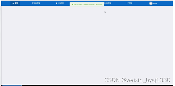 系统管理员进入系统后台可以查看:首页、网站管理(轮播图、通知公告)、内容管理(餐饮资讯、资讯分类)、人员管理(管理员、普通用户、餐饮商家)模块管理(菜品分类、美食菜单、堂食订单、出餐信息、外卖订单、配送信息、取消订单)等功能模块。如图5-2所示。