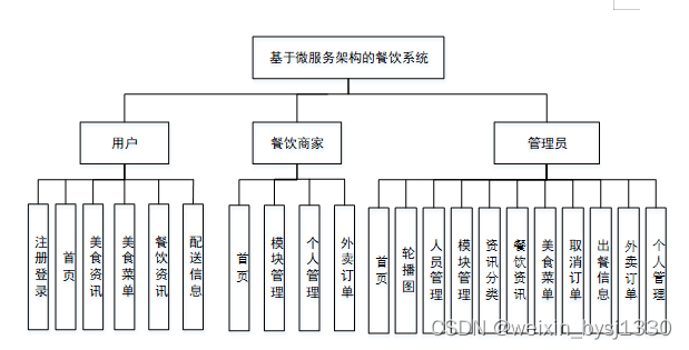 (1)功能要求:主要功能包括首页、网站管理(轮播图、通知公告)、内容管理(餐饮资讯、资讯分类)、人员管理(管理员、普通用户、餐饮商家)模块管理(菜品分类、美食菜单、堂食订单、出餐信息、外卖订单、配送信息、取消订单)等功能模块。