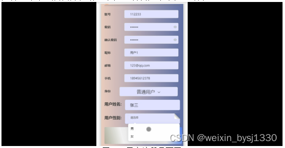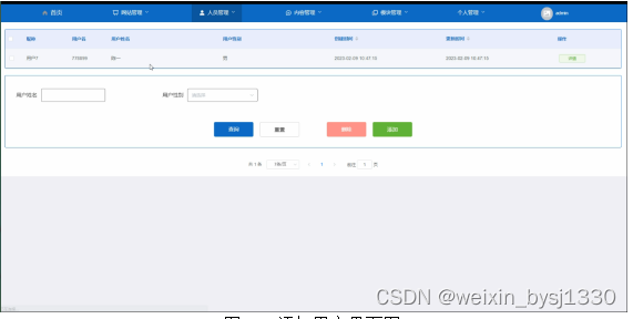 人员管理,在人员管理页面可以查看用户姓名,用户性别,昵称、用户权限等内容,可以进行通过输入用户ID,用户名,用户密码和选择角色添加用户。如图5-3所示。