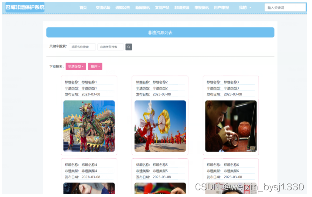 巴蜀非遗保护系统主要功能模块包括首页、轮播图、通知公告、资源管理(新闻资讯、资讯分类)交流管理(交流论坛、论坛分类)系统用户(管理员、注册用户)模块管理(非遗资源、非遗类型、申报资讯、资讯类型、用户申报),采取面对对象的开发模式进行软件的开发和硬体的架设,能很好的满足实际使用的需求,完善了对应的软体架设以及程序编码的工作,采取MySQL作为后台数据的主要存储单元,采用SSM框架、JSP技术、Ajax技术进行业务系统的编码及其开发,实现了本系统的全部功能。本次报告,首先分析了研究的背景、作用、意义,为研究工作的合理性打下了基础。针对巴蜀非遗保护系统的各项需求以及技术问题进行分析,证明了系统的必要性和技术可行性,然后对设计系统需要使用的技术软件以及设计思想做了基本的介绍,最后来实现巴蜀非遗保护系统和部署运行使用它。