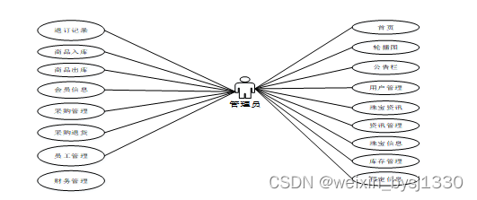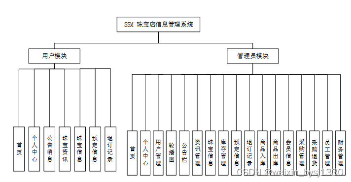 珠宝店信息管理系统的后台中,管理员对用户在前台提交申请产生的数据进行处理,以满足用户的需求。前台系统和后台系统有数据交互,整个系统各个部分相互独立又密不可分。后台的功能主要包括用户管理、珠宝信息、库存管理、预定信息、退订记录、商品入库、商品出库、会员信息、采购管理、采购退货、员工管理、财务管理。
