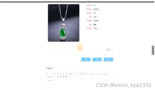 (2)商品模块:主要包括商品浏览、珠宝信息展示、商品搜索、商品收藏、预定信息、商品评论等功能。