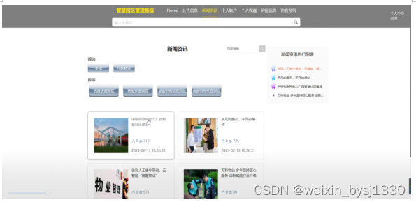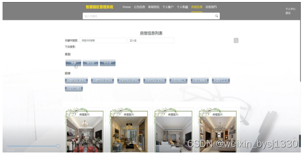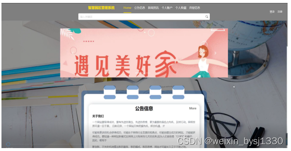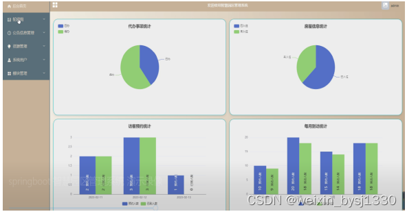 管理员登录进入智慧园区管理系统可以查看首页、公告管理、用户管理(管理员、普通用户)资源管理(新闻资讯、资讯分类)模块管理(房屋信息管理、代办事项管理、租赁信息管理、访客预约管理、每月到访管理)等信息,如图4-6所示。