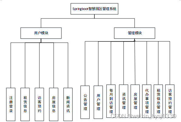 (3)确定好系统使用的技术,进行在线确认系统所划分的用户角色,并且根据用户角色划分确定所要设计的功能模块,对基于Springboot的智慧园区管理系统的设计主要划分用户角色,并所使用的功能模块也相应不同,但是系统的数据库实现的内容是交互的,用户可以随时根据自己的需求进行信息查看,对于系统工作人员可以根据自己的分管内容进行在线信息的处理及操作。