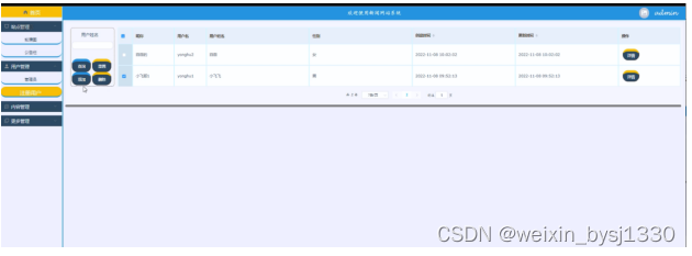 (2)用户管理:当点击“用户管理”这一菜单的时候,会出现管理员+注册用户两个子菜单,可以对这两个模块进行增删改查操作;