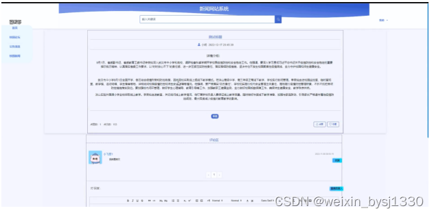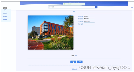 当访客点击了任意校园新闻后将会进入该新闻的详情界面,可以了解到该校园新闻的用户姓名、新闻分类、新闻名称、发布时间等,同时可以对该新闻进行收藏+点赞,新闻详情展示页面如图4-7所示。