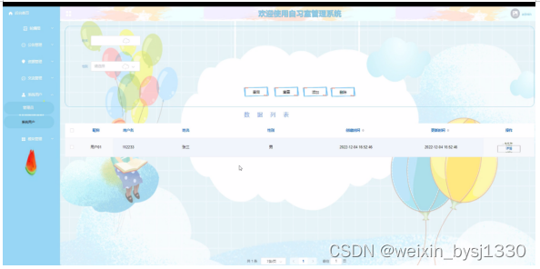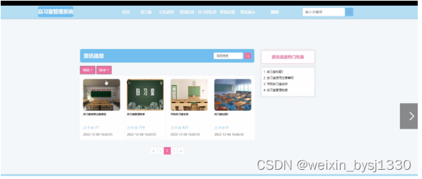 2. 系统功能还不够完善,无法提供丰富多彩的在线功能,只能实现管理员:首页、轮播图、公告栏、资源管理(资讯信息、资讯分类)交流管理(留言板、留言板分类)系统用户(管理员、系统用户)模块管理(自习室信息、分类管理、预约信息、签到信息、签退信息、意见反馈、信用积分、意见展示)系统管理等一系列功能。