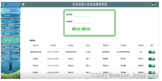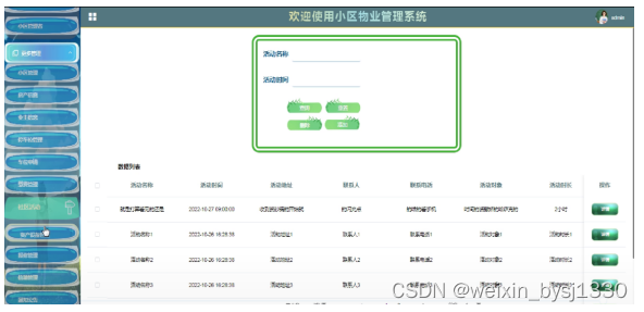 (4)社区活动管理:小区管理者点击“社区活动”这一按钮后会弹跳出社区活动列表、可以对活动进行增删改查操作;