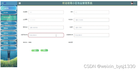 当业主在后台点击 “报修申请”这个按钮,会出现报修信息填写栏,完善后点击“提交”按钮,报修申请界面如下图4.8所示。